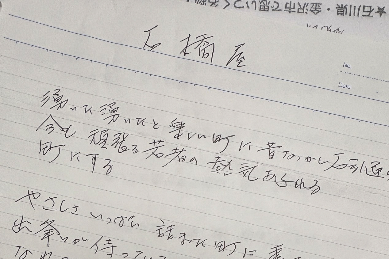 VIDEOTAPEMUSIC:ああ、石橋屋さんですね。アンケートの中に“歌詞に入れて欲しい言葉があったら書いてください”っていう項目はあったんですけど、石橋屋さんだけ、一曲丸ごとみたいに歌詞を書いてくれて、すごく気合が入っていた。何をきっかけに作り始めようかなと思ったときに、まずリズムとコード進行みたいなものを作って、それに合わせて僕はずっと石橋屋さんの書いた歌詞を口ずさみながらメロディを考えていました。「湧いた湧いたと楽しい町に〜」って、ほんとに歌い出しはあのままです。ほんとに。